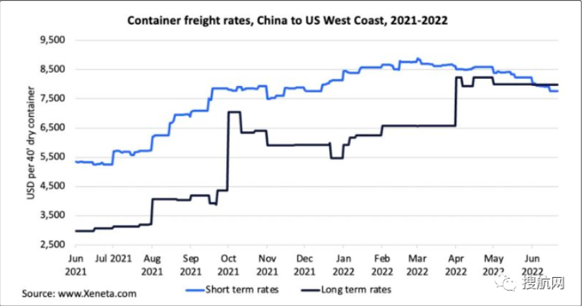 2021-2022跨太平洋航线运价(至美西),蓝线为现货运价,黑线为长约运价/图源:Xeneta