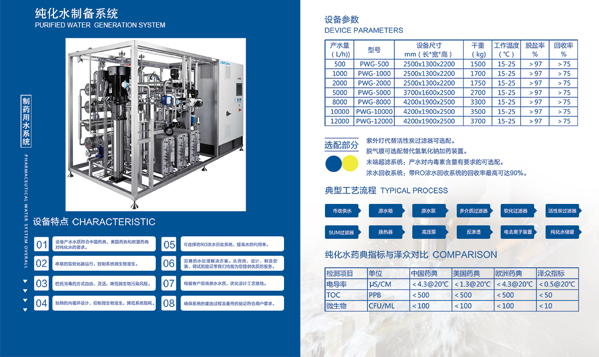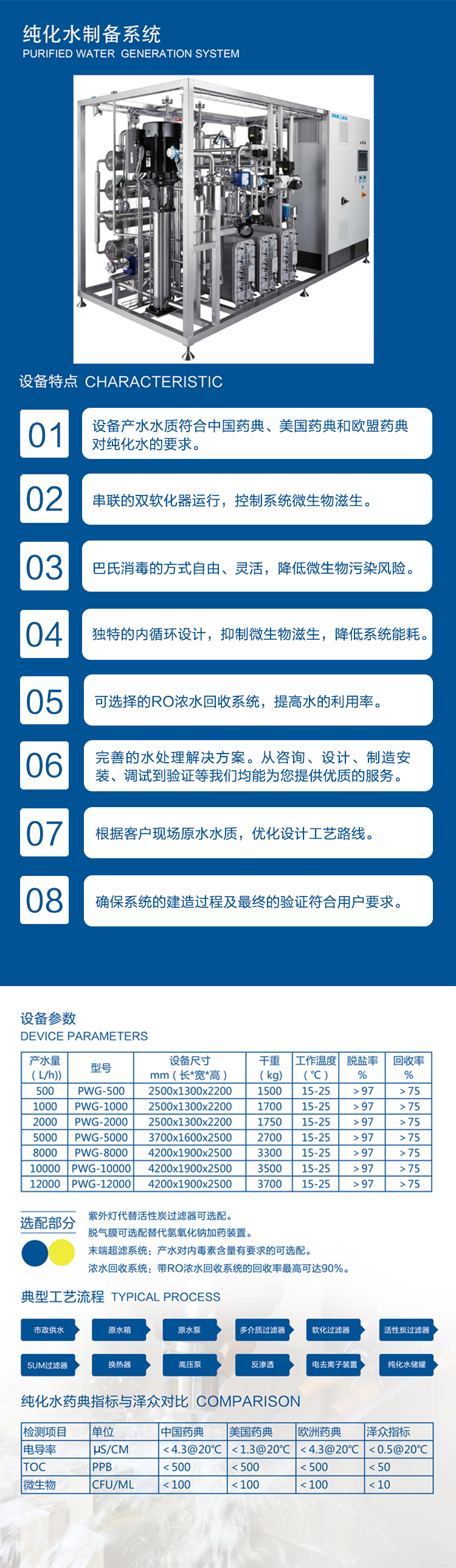 设备产水水质符合中国药典、美国药典、欧盟药典对纯化水的要求。