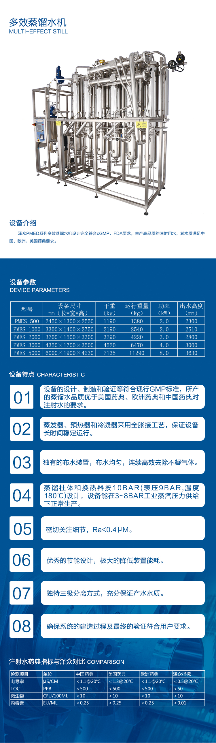 设备产水水质符合中国药典、美国药典、欧盟药典对注射水的要求。